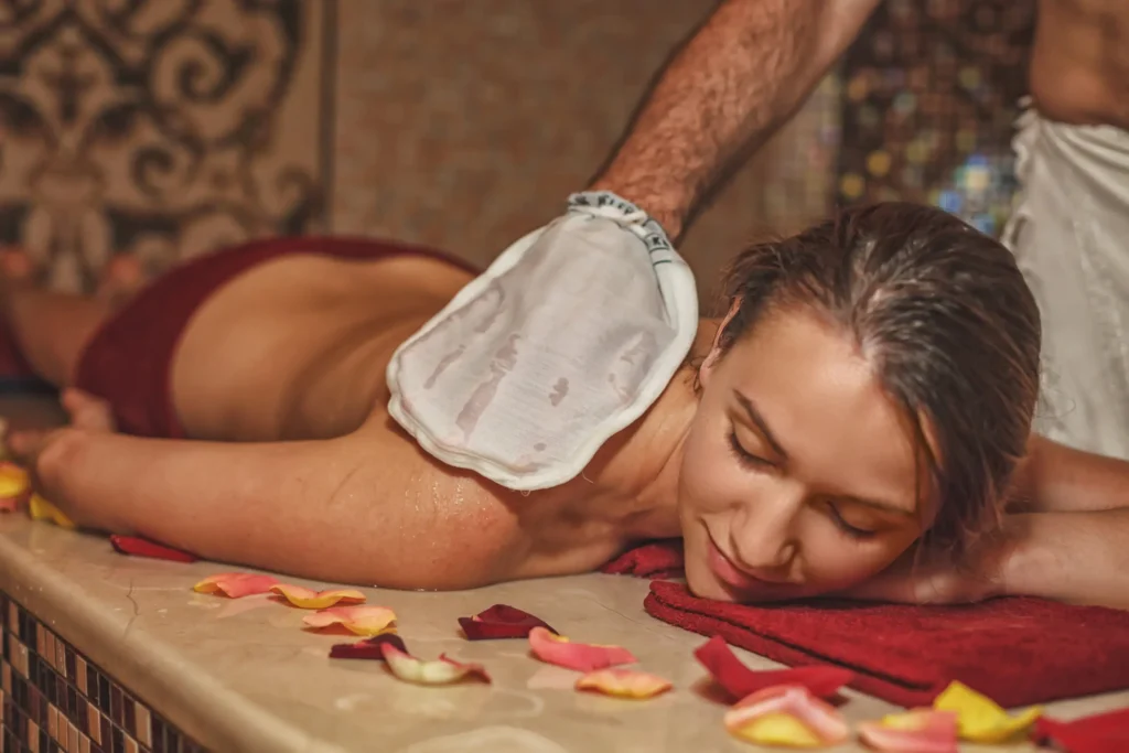 After the warming up, the peeling procedure begins. It’s performed on a heated marble table (gebek) using a Turkish glove, or kessa, which has a rough surface.